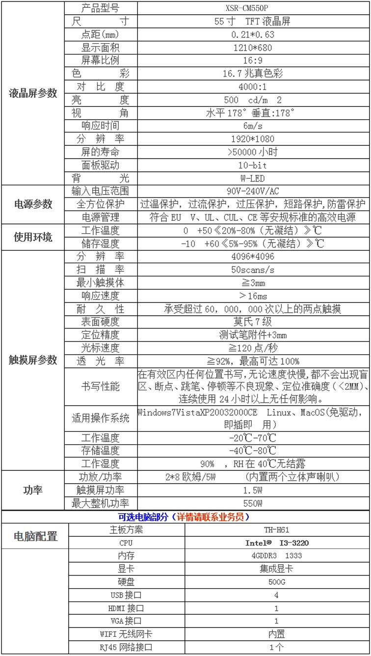 新視銳55寸觸摸一體機——立式紅外觸摸產(chǎn)品參數(shù):