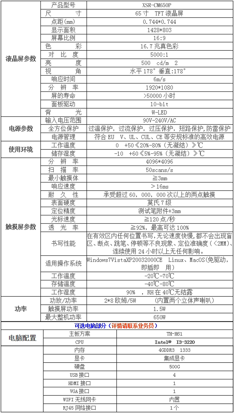 新視銳65寸觸摸一體機——立式紅外觸摸產(chǎn)品參數(shù):